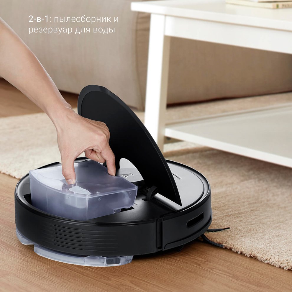 Робот-пылесос получил двойной контейнер, который совмещает в себе пылесборник и резервуар для воды. Объем баков составляет 470 и 350 мл соответственно.