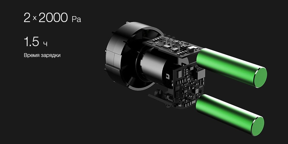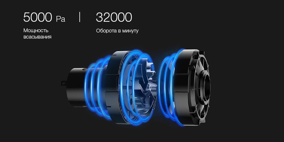 Мощность всасывания достигает 5000 Pa, благодаря максимальная скорость 32000 об / мин, с использованием двух мощных аккумуляторов ,мощностью 2000 мАч.