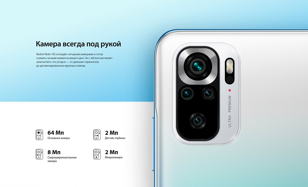 Блок камер содержит четыре линзы. Основная камера – на 64 Мп. По этому показателю Xiaomi Redmi Note 10S лучше более ранней версии (без литеры S). Кроме нее за создание ярких и запоминающихся кадров отвечают: